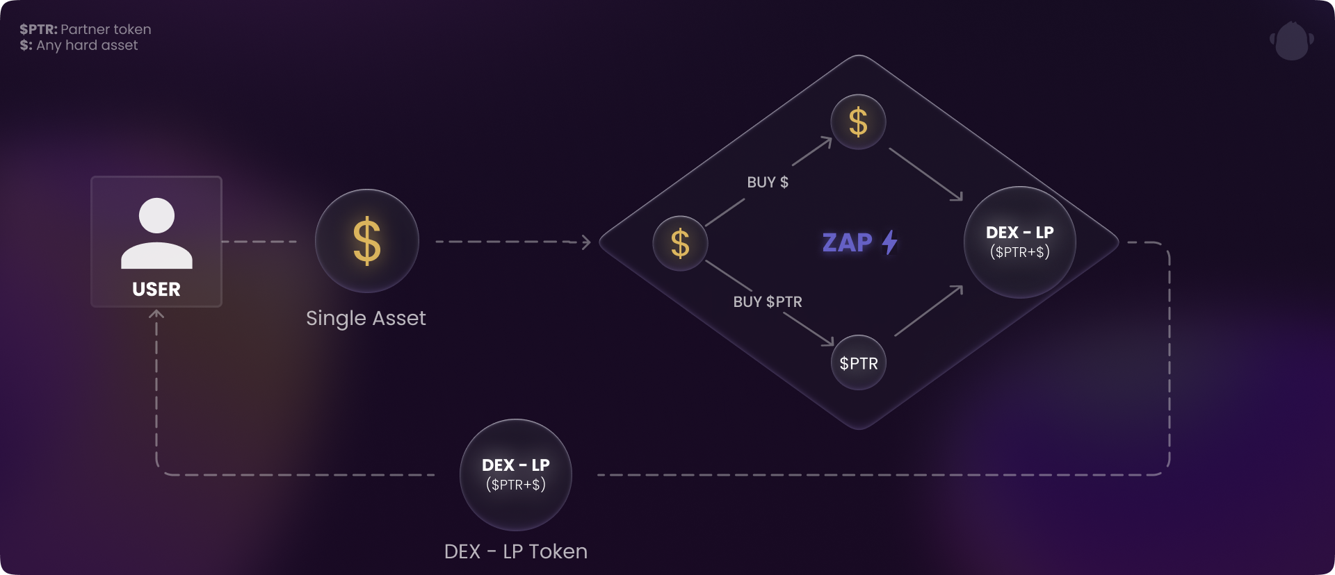 It allows users to go from a single token to a liquidity provider (LP) token in a single transaction. Before Zap, users had to manually acquire both tokens of an LP pair, then combine them to receive a LP token that represented that LP pair.