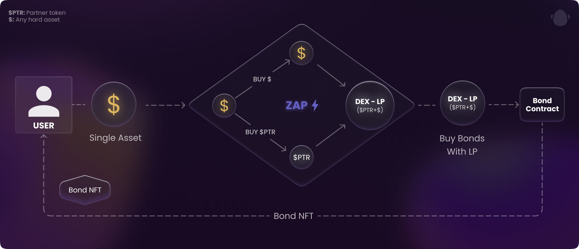 This feature enables users to directly purchase bonds using a single token, simplifying the process significantly. Previously, users had to first form a Liquidity Pair (LP), either manually or via a single-token-to-LP Zap, and then use these LPs to buy bonds. By simplifying this process, it minimizes the number of transactions required for users to begin acquiring vesting tokens at a discount through Bonds.